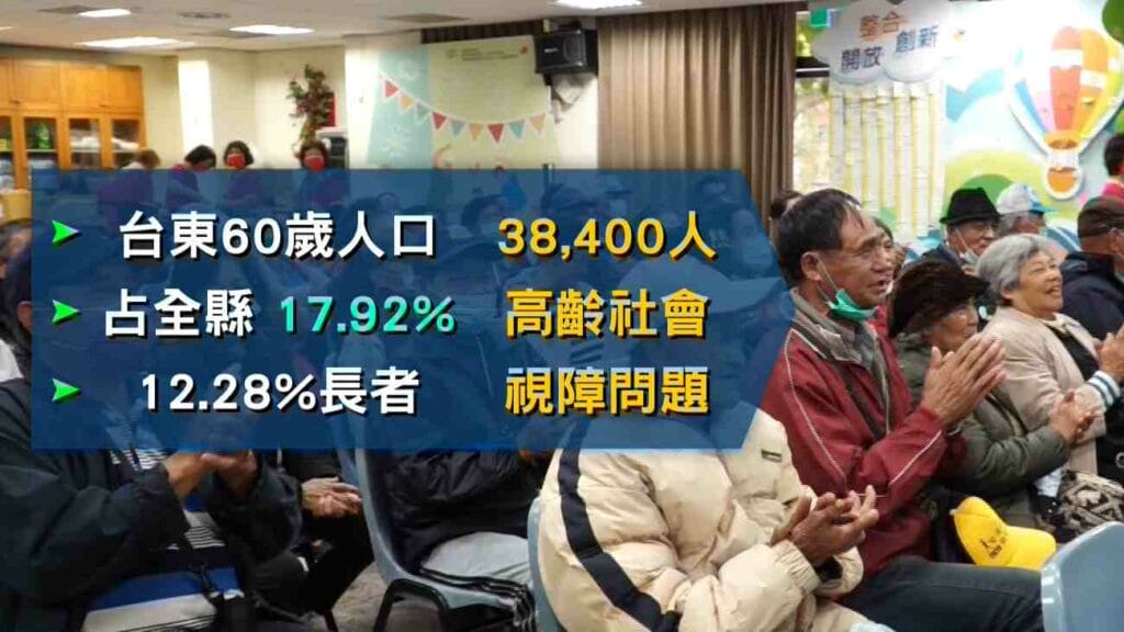 台東縣60歲以上老年人口約有38,400人,占全縣總人口的17.92%,已達高齡社會結構,而其中更有12.28%的長者患有視力障礙問題。為此,台東縣府編列200萬經費,免費為60歲以上長者驗光配鏡,23日辦理「敬老好視力老人會」活動,邀請在地知名善心菜販陳樹菊一同推廣。