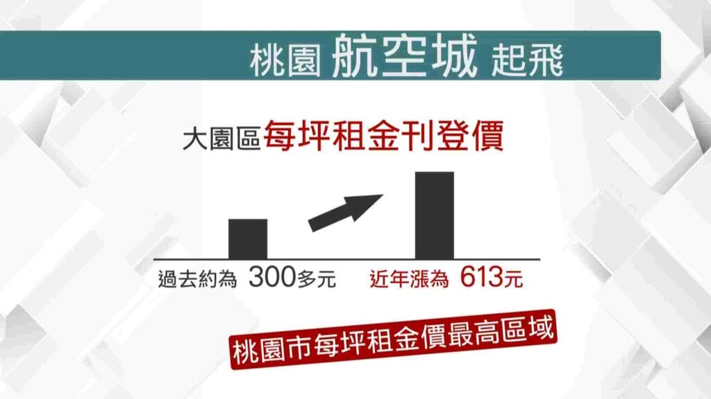連鎖房仲業店長黃金國提到,「近年來觀察就是在,航空城因為開發關係,大園區每坪租金有很大的調幅,因為它有青埔特區,這些豪宅造成整個租金有拉升上來。」