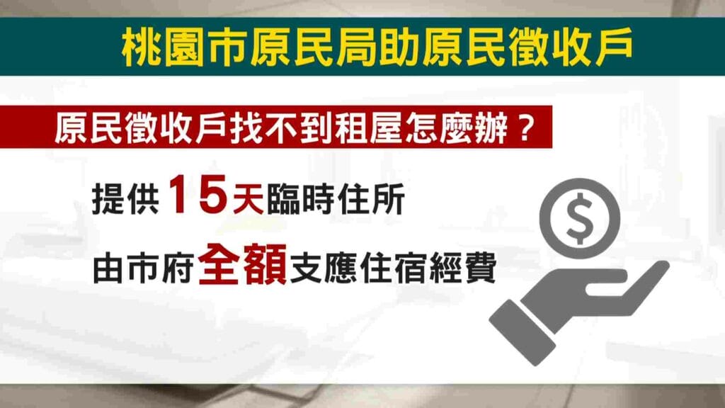 正因為現階段近萬名徵收戶在四處找房,租屋市場也隨之熱絡,但桃園市原民局向族人喊話,找不到房子不用擔心,市府將媒合臨時住所,且15天住宿經費,由市府支應,只盼協助族人在動盪的搬遷過程,不致流離失所。