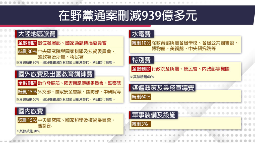 幾項大家關注的項目包括大陸地區的旅費、數位發展部、NCC的部分全數刪除,國外旅費及出國教育訓練費,國內旅費也刪了一部分,還有特別費統刪60%,但是行政院、陸委會、原民會、內政部等的特別費是全數刪除的;另外還有媒體政策業務統刪60%、軍事裝備及設施統刪3%等等。而在在野黨聯手之下,通過提案要求總刪減預算,不得低於939.75億元,也就是約總預算的3%。