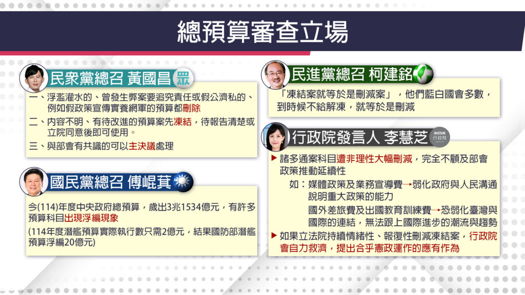 民眾黨總召黃國昌表示,黨團審預算的三原則:浮濫灌水的、有弊案的、養網軍的全刪,內容不明待改進,則凍結等行政機關報告解凍,與各部會有共識的則以主決議處理。國民黨總召傅崐萁則說,114年度中央政府預算歲出達3兆1534億元,創下歷史新高,當中不乏有浮編現象,像是潛艦預算,114年執行數僅需2億元,國防部卻編了20億,因此凍結,也預告國民黨要刪的預算共1111億元。