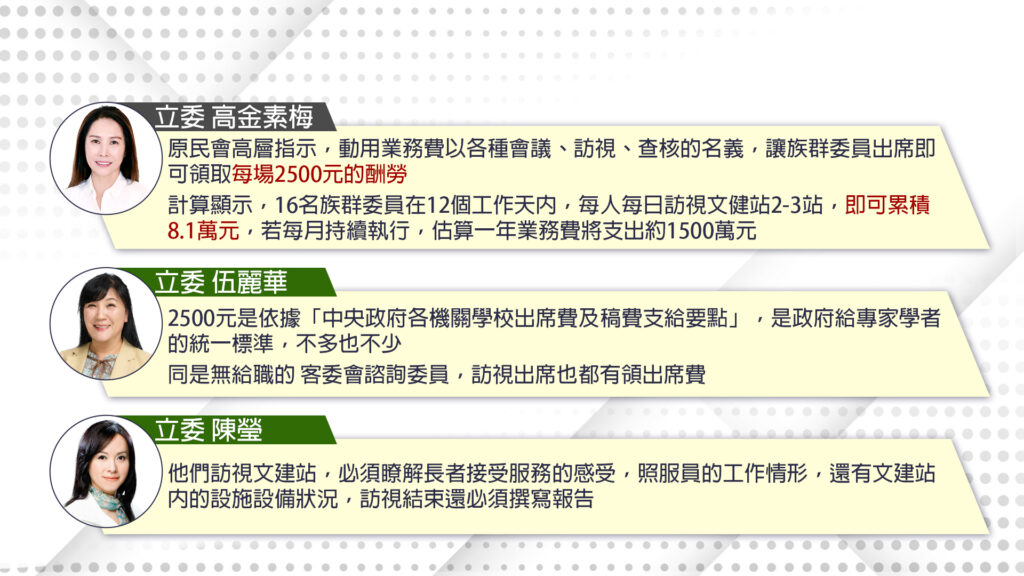 立委高金素梅指出雖然族群委員改無給職,但只要訪視文健站,每場出席費2500,每日2、3站,12個工作天就可累積8.1萬元,業務費每年仍支出1500萬元;因此這幾天他表達立場支持民眾黨刪減多餘人事費的提案。但民進黨的立委伍麗華跟陳瑩,就立刻反駁了,說2500元是政府給專家學者的統一標準,不多也不少,認為高金素梅是要馬兒好卻要馬兒不吃草。族群委員爭議的戰火持續延燒。