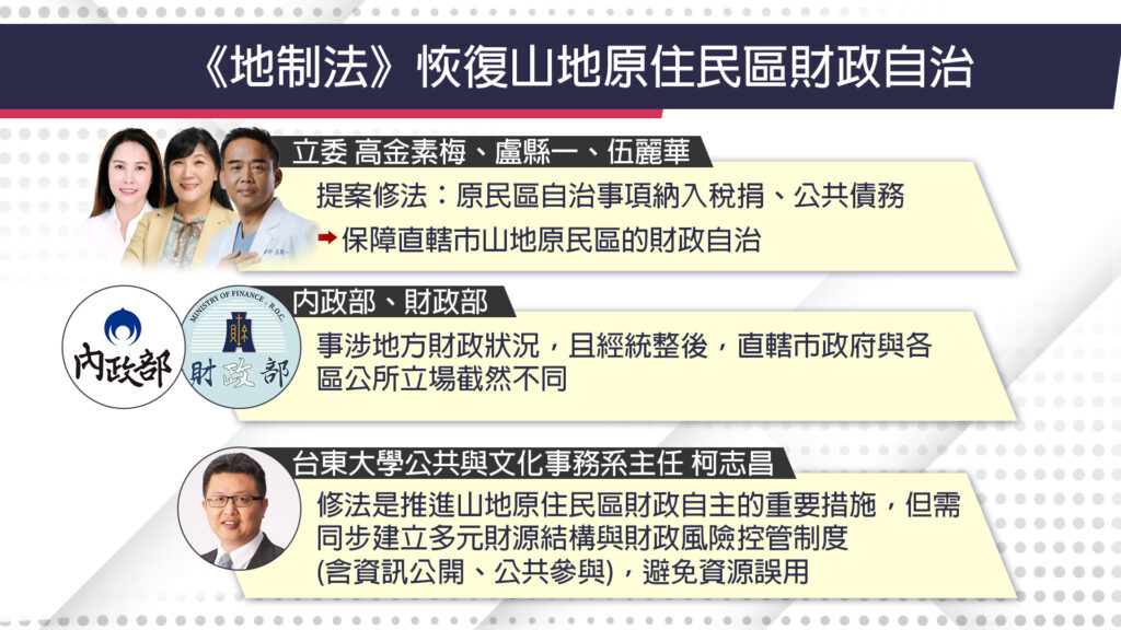 另外關於原民大事,這周一立法院審查地方制度法,立委高金素梅、盧縣一、伍麗華提修法案,要讓直轄市山地原住民區恢復財政自治,納入稅收、舉債等字樣。