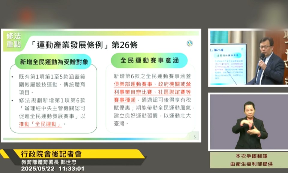 教育部體育署長 鄭世忠:「那在這次新增第6款全民運動賽事,其中涵蓋俱樂部運動賽事、政府機關或營利事業自辦的比賽,還有社區聯誼賽等等賽事種類,通過認可後得享有稅賦的優惠。」