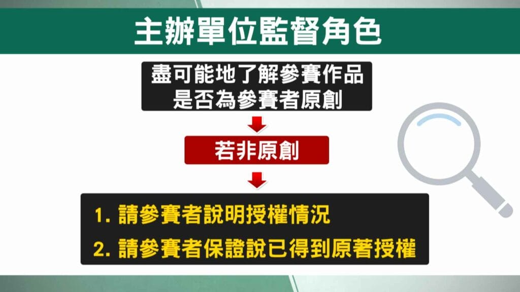 律師也表示,主辦單位站在監督的立場,基本上需要盡可能地了解參賽作品是不是參賽者的原創,若不是,務必要請參賽者將將授權情況說明清楚,或是請參賽者保證已經得到原著的授權。由於當代影音創作媒材越來越廣,針對創作故事的原型以及著作權授權的部分,更是務必要再三注意,以免侵權事件的發生。