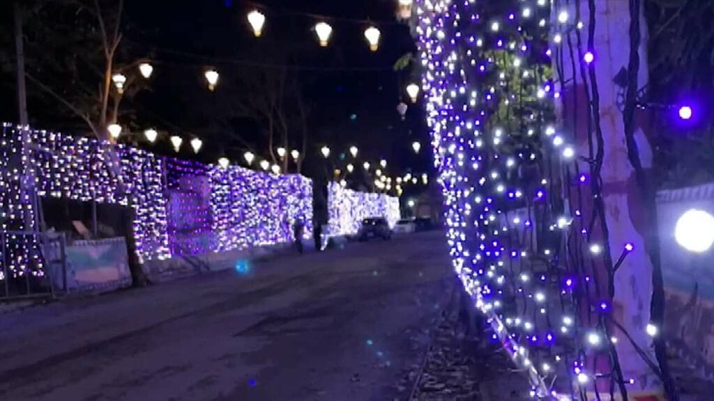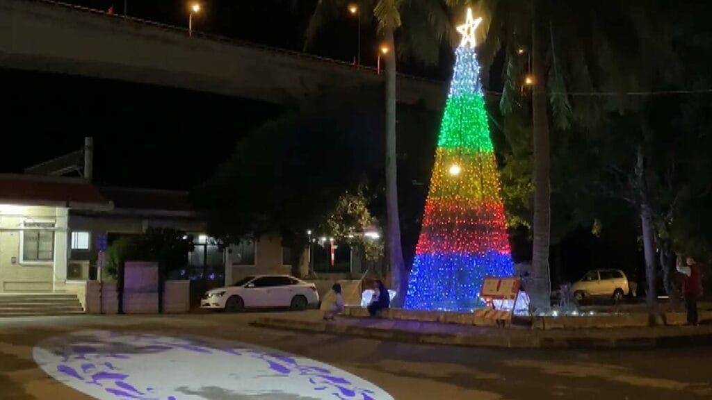 一座高8米的聖誕樹,佇立在金崙火車站前,還有長約100公尺的燈海,點亮金崙部落的夜晚,這是太麻里鄉公所打造的燈飾花海,特別結合南迴藝術季的裝置藝術作品,將燈飾延伸通往海邊的涵洞,吸引不少民眾前往拍照打卡留念。
