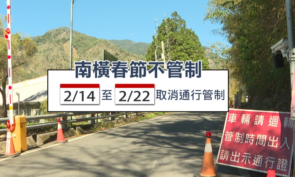 春節假期將近,為了讓遊客能彈性規劃南橫公路旅遊,公路局調整梅山口至向陽路段交通管制時間,原本每周二、三、四實施的禁行規定,2月14日至2月22日春節期間全面取消。