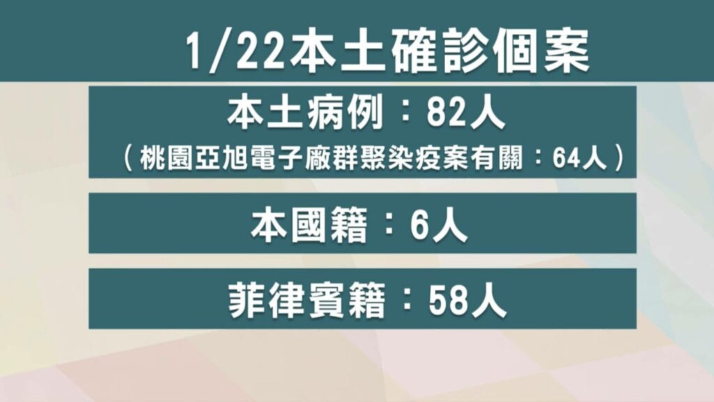 中央流行疫情指揮中心指揮官陳時中說明,「本土的案例有82例,當然82例是一個非常高的數目,主要的來源大概是有2個,一個是在高雄的港區裡面,從第一天的幾個案例,到21號又新增14個案例;另外是在桃園的自貿經濟園區裡面的一家亞旭公司。」