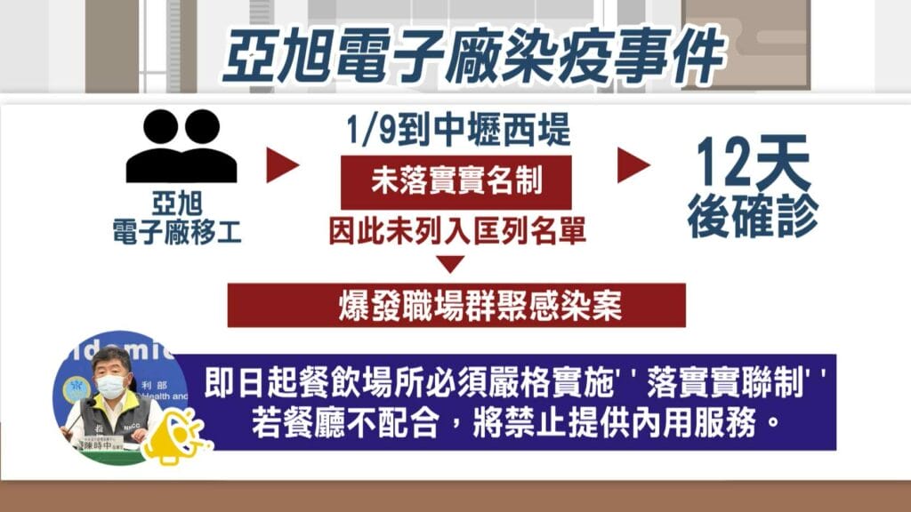 指揮中心指揮官臉色凝重公布,22號本土確診人數暴增到82例,其中有64例跟桃園亞旭電子廠群聚有關,確診個案中有6位是本國籍,其餘58位是外籍移工,電子廠染疫源頭,可回溯到有2名亞旭電子廠移工未落實實聯制,因此成為中央匡列接觸者的漏網之魚,才釀出電子廠群聚感染。因此指揮中心下令,即日起餐飲場所必須嚴格’落實實聯制。
