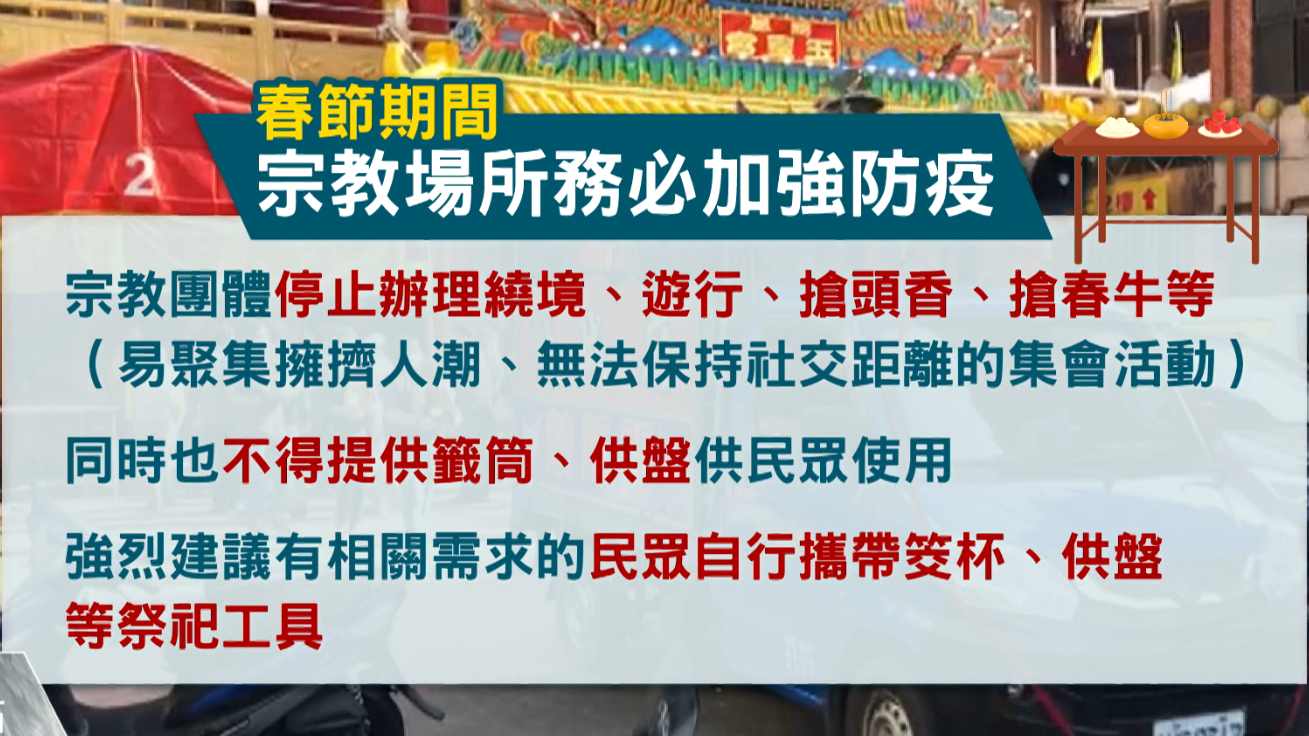 內政部也對春節期間,宗教場所跟宗教集會活動加嚴防疫措施,像是停辦繞境、遊行、搶頭香等活動,也禁止提供籤筒、供盤等器具,另外民眾進入宗教場所後禁止飲食。