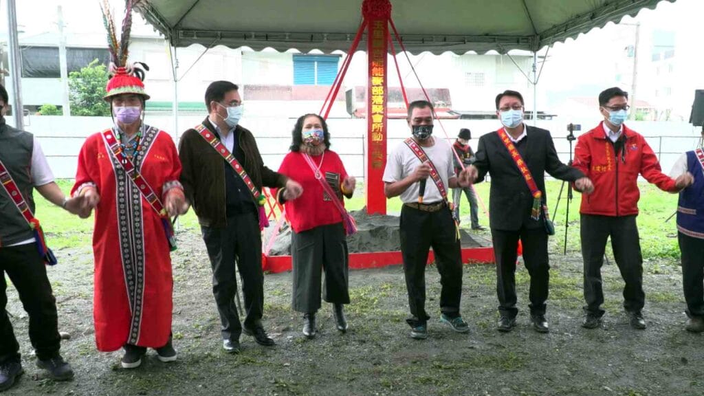 Cinemnemay(吉能能麥)部落聚會所興建工程動土儀式,部落Kakita’an特別率領原民會主委及與會的來賓共同舉行祈福儀式,祈求祖靈保佑工程順利,隨後在安排下分別戴上安全帽,並持金鏟子共同進行動土儀式。
