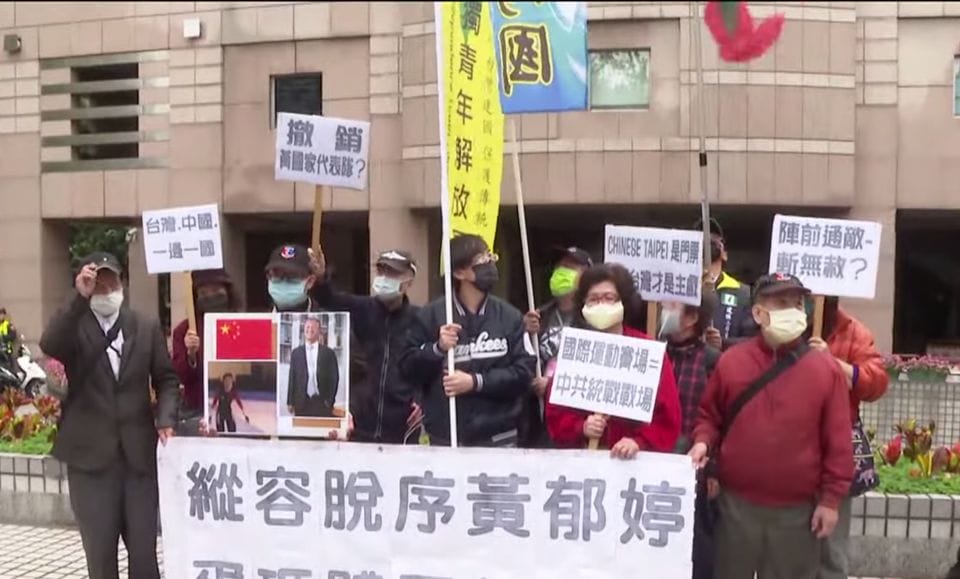 抗議團體對著競速滑冰選手黃郁婷,以及體育署代理署長林騰蛟的照片,怒砸雞蛋,表達抗議跟不滿。我國競速滑冰選手黃郁婷,因日前身穿中國隊服拍照,引爆各界熱議。抗議團體指出,國際運動賽事除了展現國力,更存在國際政治密切連動,中共當局不斷打壓台灣的國際空間,身穿中國隊服將造成政治效應,要求選手跟署長必須公開說明清楚,整件事情的來龍去脈。