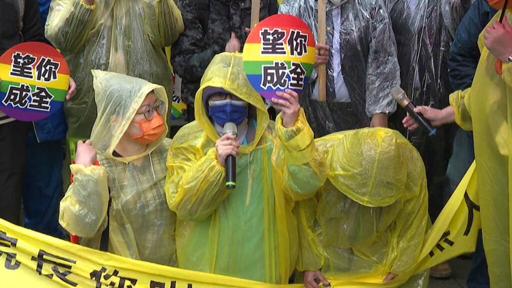 本該是幸福滿滿的西洋情人節,跨國同志情侶,卻在這天冒著雨、頂著寒風,來到行政院前,抗議陳情。台灣同性婚姻合法化到如今即將滿 3 年,跨國同志伴侶卻因現行《涉外民事法律適用法》相關規定,被阻擋在外。