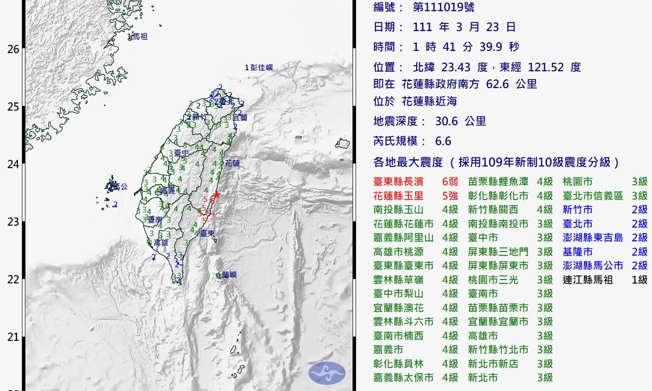 03/23 半夜不平靜,地牛翻身不斷!規模最大6.6,震度最大6級,震央於花東外海。