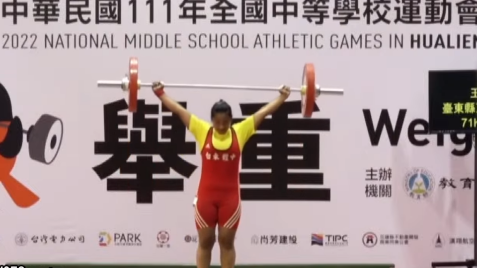首先看到的是舉重國中女子組71公斤級,排灣族選手王彤在抓舉部分,第一次試舉輕輕鬆鬆就舉出70公斤的好成績,第二次試舉更是直接挑戰72公斤,最後以抓舉74公斤、挺舉89公斤以及總和163公斤,三項突破大會紀錄,最終奪得銀牌。