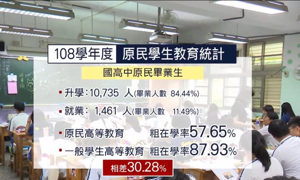 根據原民會原住民族教育調查統計,108 學年度國高中原民畢業生,10,735 人選擇繼續升學,占畢業人數 84.44%,直接就業的1,461 人,占畢業人數 11.49%,而在高等教育粗在學率57.65%,與一般學生高等教育粗在學率87.93%,相差 30.28%。長年觀察孩童發展的部落教會牧者談到,若家庭功能發揮不彰顯,孩子對自身未來迷惘,書讀不下去就選擇輟學就業,產生階級複製。