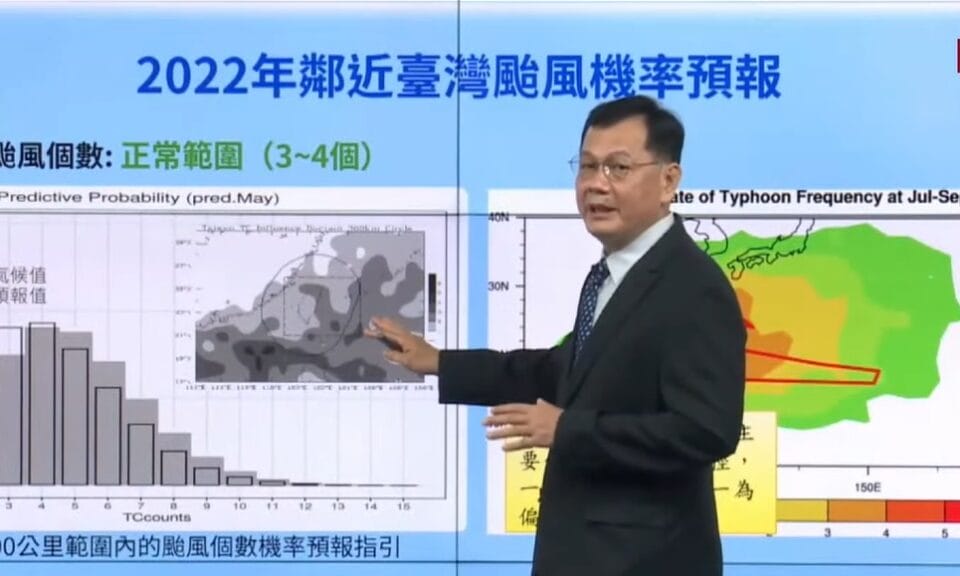 氣象局預報中心主任呂國臣說:「那就機率上分配來看,在進入我們鄰近我們台灣海域甚至包含台灣這一塊,我們可以看到三個到四個機率是最高的情況。」