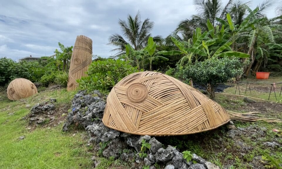 駐村藝術創作者Holomei 林戎依說:「因為我們有聽當地藝術家,他們在分享的時候,比如說伊祐,他會說他們這邊他們去捕魚的時候,會有5個大浪跟3個小浪,然後他們會知道什麼時候進去捕魚,這個狀態讓我覺得這個是很美的畫面。所以我就把浪的感覺得用藍色系的繩子把它呈現出來。」