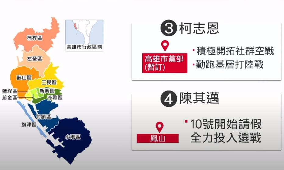 先來看到,各黨爭相插旗的雙北地區,蔣萬安競選總部,以親子友善為主題,傳達了對城市治理的概念,因此命名為市民基地。而最早成立競總辦公室的黃珊珊,有望角逐首都第一位女性市長,希望以副市長的行政歷練,延續台北的改變,再來看到轉換跑道的阿中部長陳時中,競選總部就是2年前蔡總統連任的競總舊址,要延續勝選氣勢外,設計主軸也緊扣與民「溝通」理念。而新北市長候選人,綠營的林佳龍,板橋競選總部,沿用2018年蘇貞昌的競選舊址,母雞帶小雞的1+37作戰計畫也陸續啟動。 至於藍營的現任市長侯友宜,競總也設在板橋區,不過表示和四年前一樣,市民是頭家,里長是靠山,將繼續兌現市政承諾。