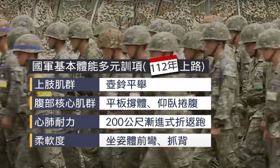 訓練參謀次長室軍事訓練處長 劉慎謨表示:「明年度開始我們另外增加有,壺鈴平舉這個選項。」