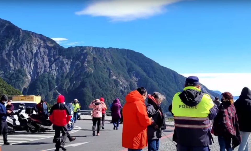 大批重型機車停在路旁觀看雲海,這裡是南橫公路台20線大關山隧道口,因為這幾天寒流發威,不少民眾趕來追雪。