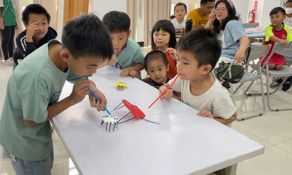 用吸管吹著紙做的蜘蛛,在桌上比賽看誰的跑得比較快,為了讓孩子減少3C產品使用的時間,原住民族家扶中心在安朔部落,辦理親子座談及手作玩具DIY,希望增加家長跟孩子間的互動機會,也降低對3C產品的依賴,提高陪伴孩子的學習時間。