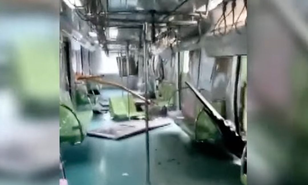 拍下捷運內部一片狼藉,10號中午台中捷運豐樂公園站附近,發生建案塔吊工程車吊臂掉落事件。砸到剛好在運行的捷運車廂,內部座椅散亂,還可以看到吊車臂就卡在車廂內。