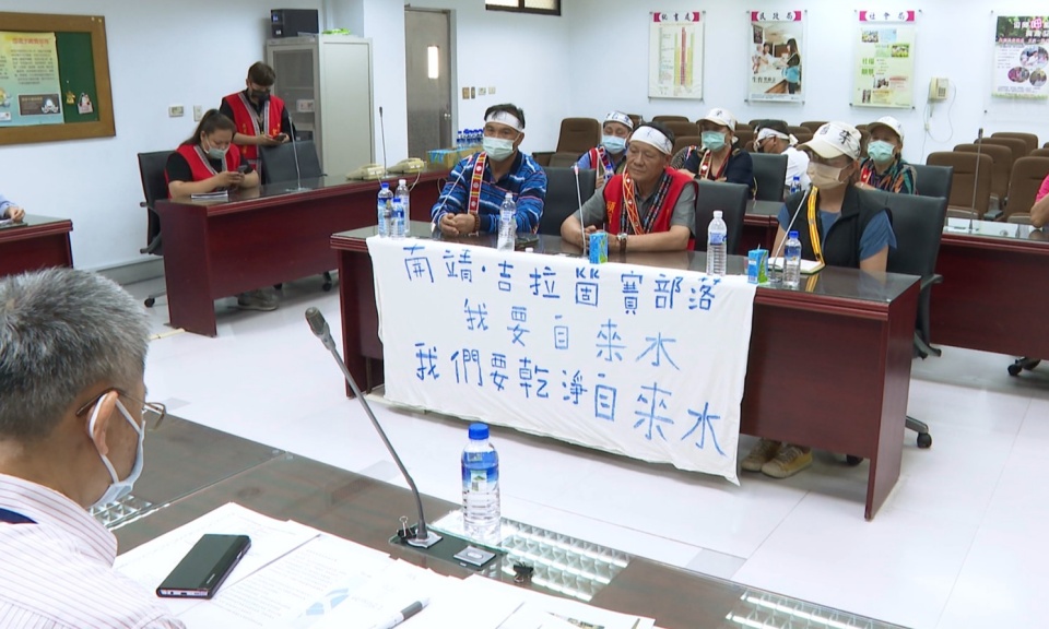 南靖部落代表族人 林俐:「我們水龍頭打開,不是自來水而是地下水,使用的都是政府給我們的桶裝水、就是水塔水這三個,怎麼夠我們46戶來使用。這二十年,已經將近有三十多人走了,是不是因為這個水源關係,我們自己部落的人,看到其實都非常害怕。」