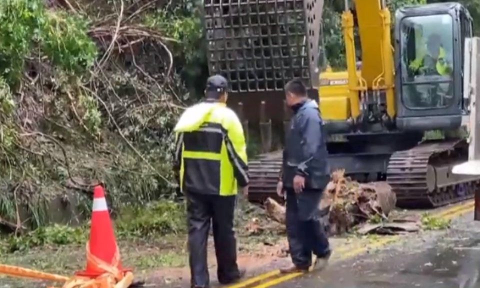 大型重機具,正在清除倒在路中的樹木,這裡是金峰鄉嘉蘭村對外唯一的聯外道路東64線,26號上午受到杜蘇芮颱風的影響,造成山邊樹木倒塌,嘉蘭村巡守隊員趕緊通報公所並合力清除障礙。