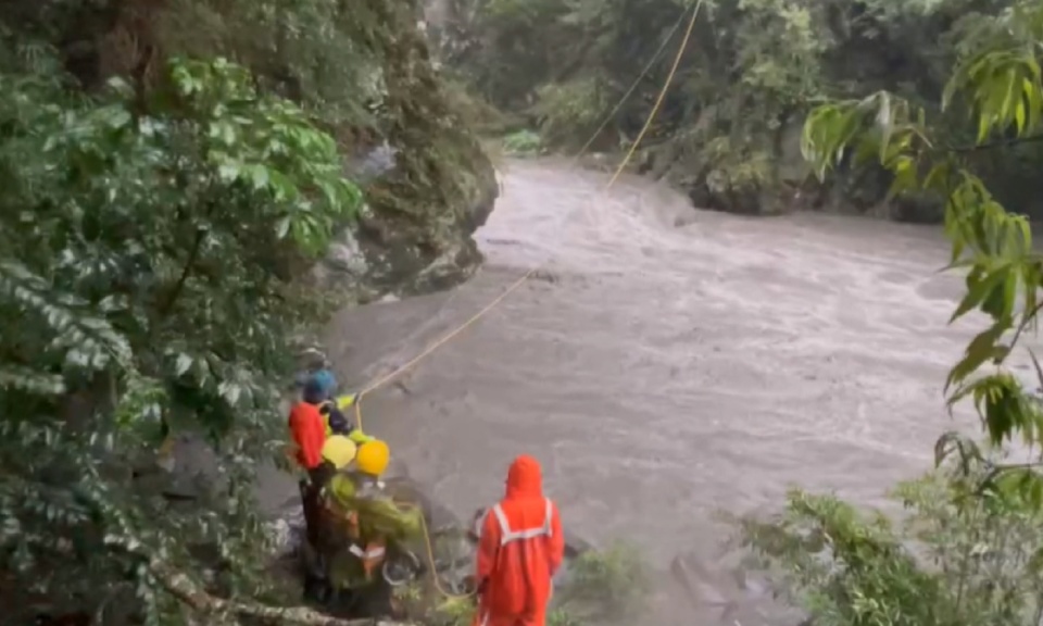 救難人員:「目前運送物資過去。」救難人員利用拋繩槍拉起繩索,運送物資到對岸,杜蘇芮颱風帶來豪大雨,山區溪水暴漲救難人員無法順利過河,救難過程也相當危險。