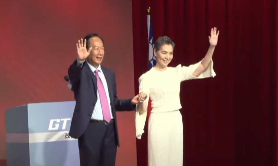 無黨籍總統參選人 郭台銘:「我曾說過我的競選搭檔能力比我強、愛心比我強、對全民共識的凝聚力比我強,賴佩霞女士便是這樣一位萬中選一的最佳人選,是我選擇競選搭檔時的唯一人選。」
