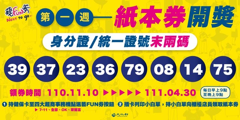 數位券中籤號碼96、15、07、30、73、98、19、11;紙本券中籤號碼39、37、23、36、79、08、14、75,文化部特別提醒,紙本券則在11月10號當天才可以開放領取。