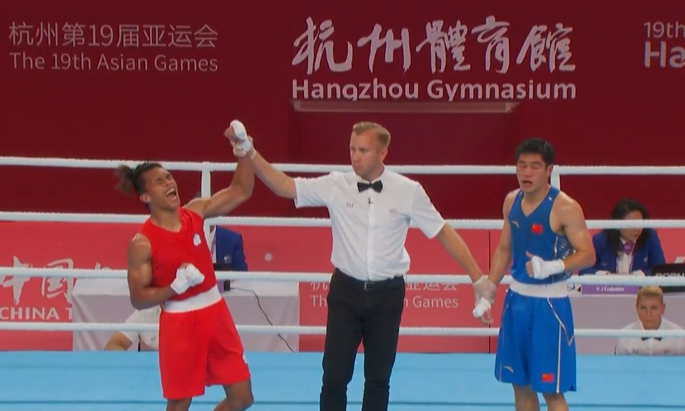 接著看到男子63.5公斤級,是由排灣拳擊好手賴主恩對戰到中國的地主選手,第一回合紅角的賴主恩便展現了他驚人的進攻能力,以及高盛的攻擊慾望頻繁與對手互相換拳,首個回合順利以五比零收下;雖然第二回合,是讓眼角見血的對手以四比一拿下,但是賴主恩是越戰越勇;到第三回合積極與對手換拳外,拳風也是更加犀利,最終也是成功三比二比數成功擊敗地主選手,闖進四強賽。