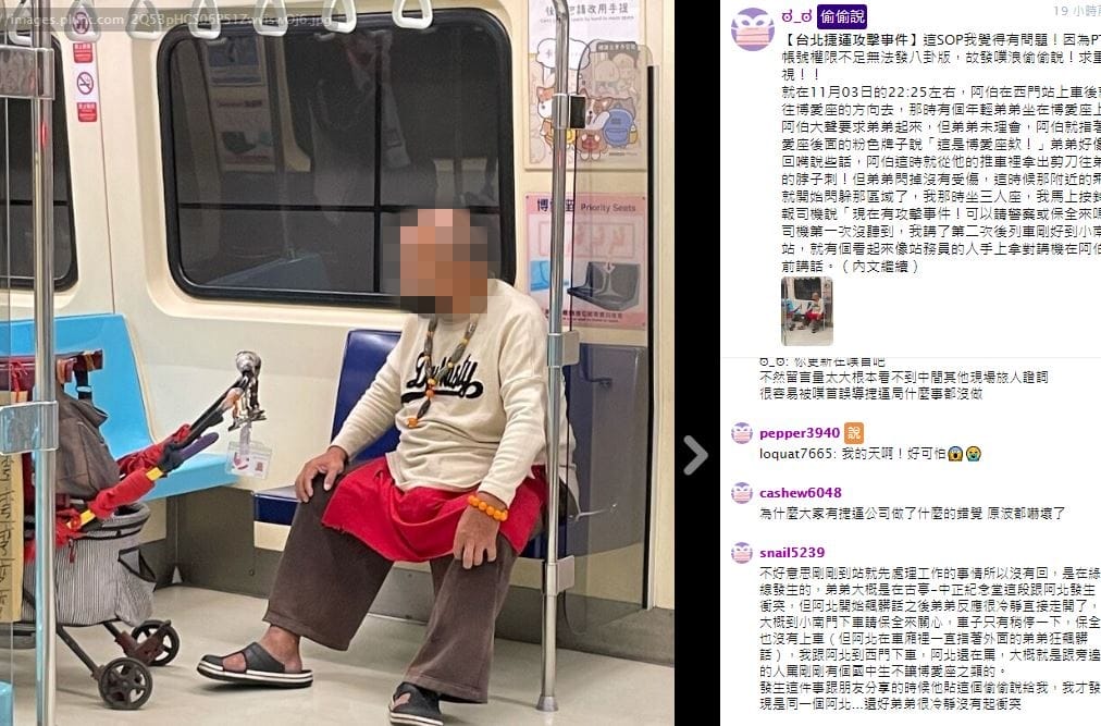 據了解,一名坐在博愛座的年輕男子,被一名推著推車的70歲阿伯要求讓座,男子疑似回嘴,阿伯一氣之下抽出剪刀,刺向對方頸部,所幸男子及時閃過,未受到傷害。