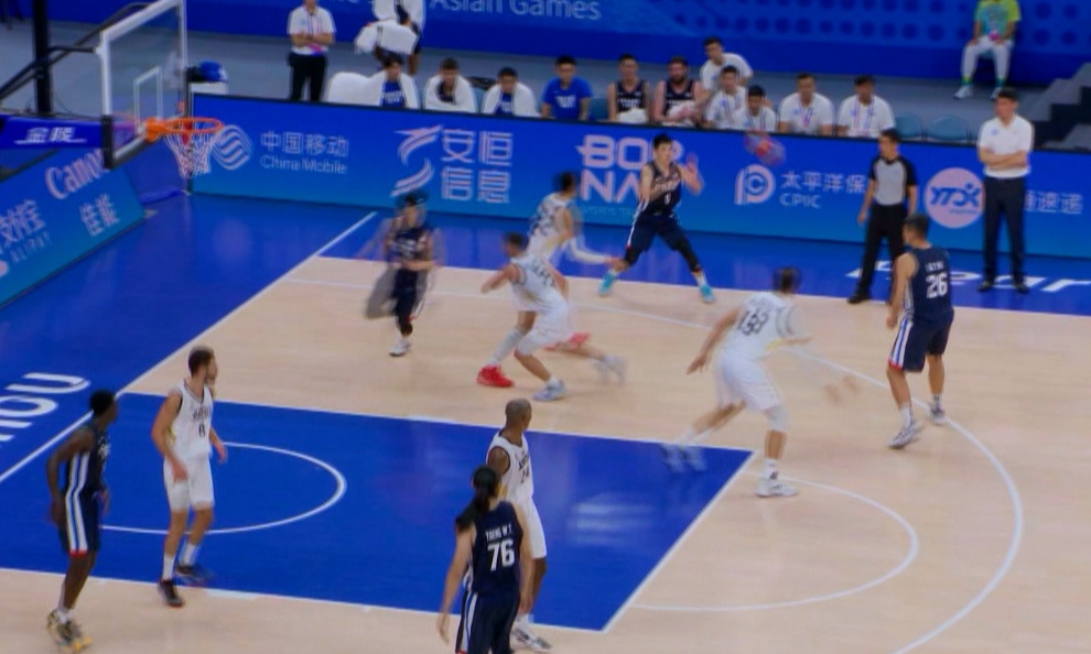 穿著深色球衣的台灣男籃進入到了四強,要交手約旦,台上的林庭謙、阿巴西、劉錚、曾祥鈞以及阿提諾來先發,克服了開賽落後,一度是把比數扳平,在上半場靠著林庭謙攻下了12分,送出三助攻,逆扛對手。