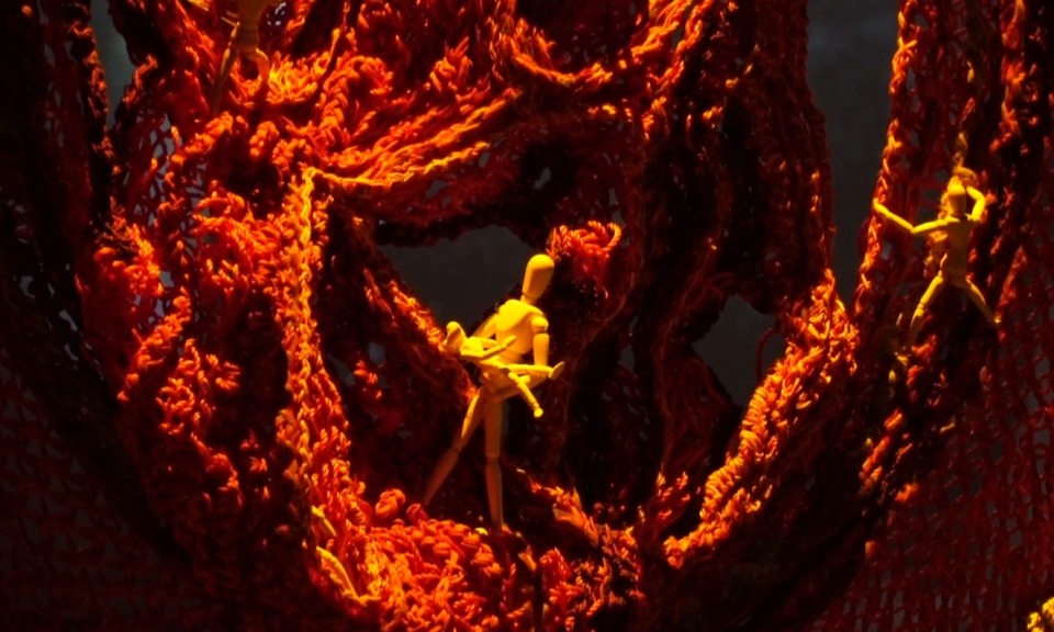 走進展間,映入眼簾的是一件鮮紅巨大的編織作品,織布上有許多木頭人偶正努力向上攀爬,這件名為「回家」的作品,由藝 […]
