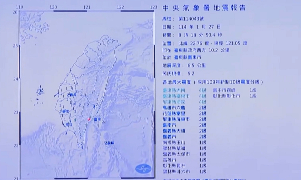 台東規模5.2有感地震 氣象署:獨立事件非餘震