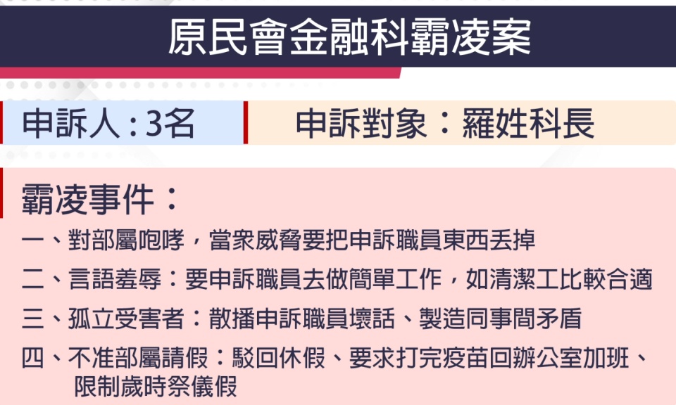 勞動部職場霸凌案爆發,陸續有受害者揭發行政機關的霸凌事件,而這把火也燒進原民會;有三名在原民會經發處金融科的同 […]