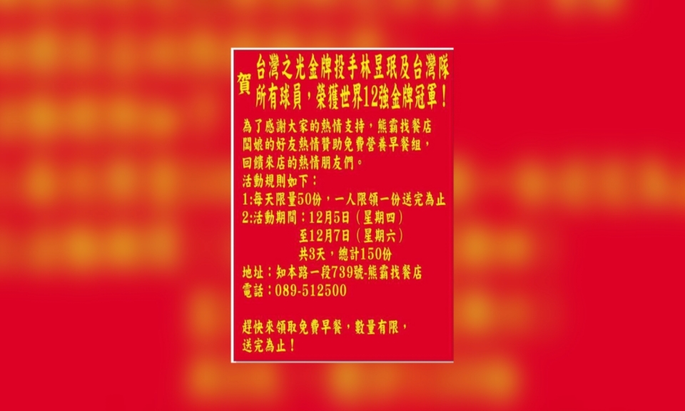 林昱珉母親感謝支持 連3天贈50份免費早餐