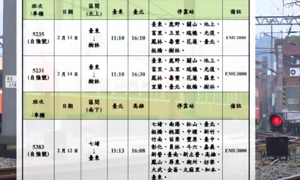 台鐵公司在早上發布最新消息,在2月12到15日再加開自強號4列次,包含東部幹線–台東往樹林2列次、西部幹線則是 […]