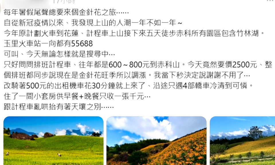 金針花季計程車資報2500元 遭疑哄抬價格