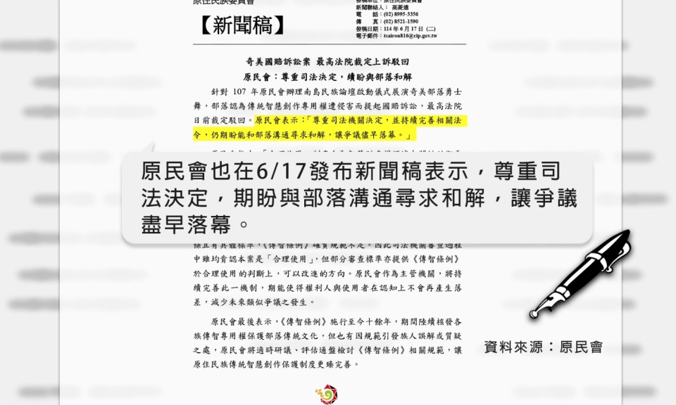 引發各界高度關注的奇美部落專用權訴訟案,5月29日最高法院宣判後駁回部落上訴,部落隨後在6/8發表聲明深表遺憾 […]