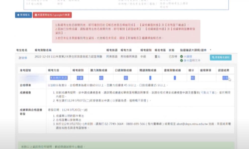 查族語認證成績 考生反映網頁表示不清楚