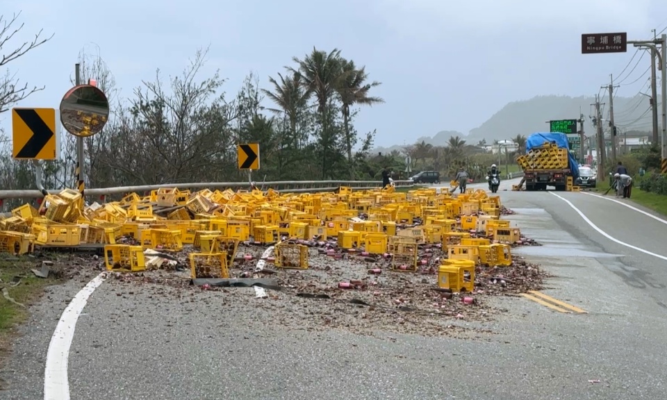 台11線貨車過彎 疑未繫緊上百箱米酒掉落