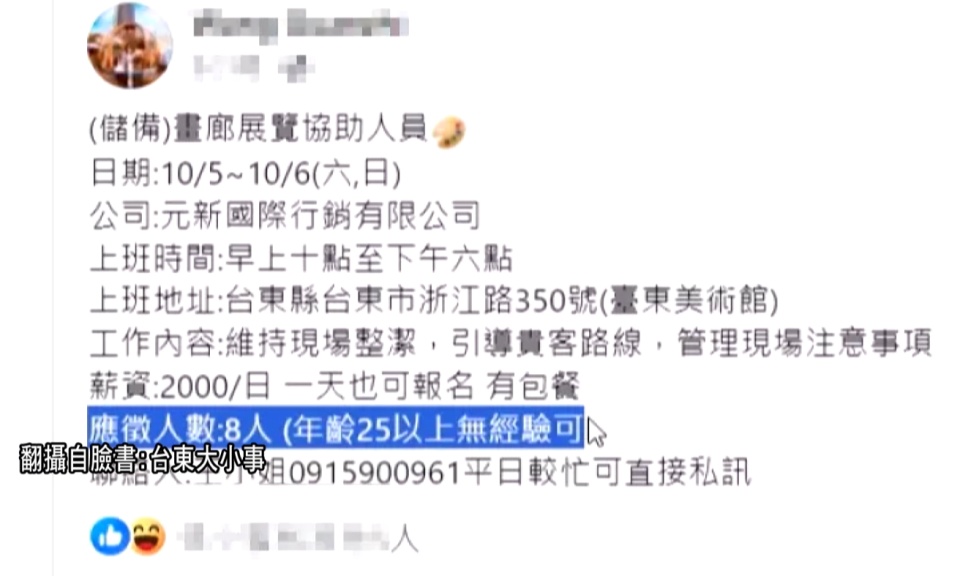 台東美術館積極策展,目前9月展覽的前置工作也已進入尾聲,但近期在台東地方臉書社群上,卻莫名出現一篇徵才訊息,表 […]