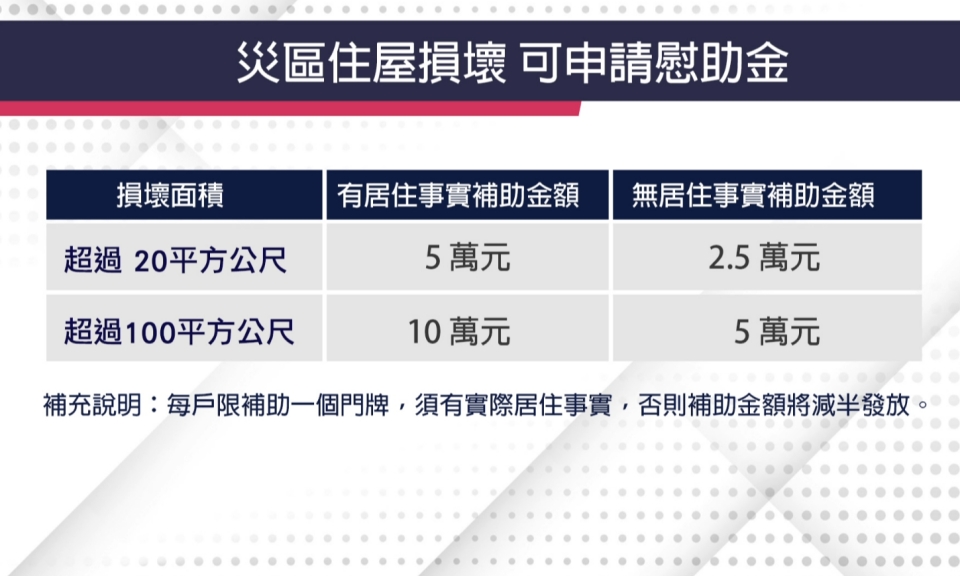 丹娜絲颱風離開將近一周,多處災區仍在搶修復原,內政部公布災後住宅慰助方案,只要房屋屋頂或外牆受損面積超過20平 […]