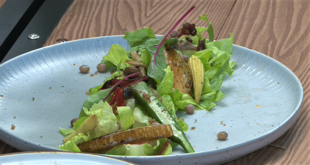 打開噴槍把醃漬過的肋排烤到微焦,盤底再以樹豆奶油馬鈴薯泥襯底,香氣四溢的梅汁紫蘇豬肋排就完成了,再加上紅藜熱沙 […]