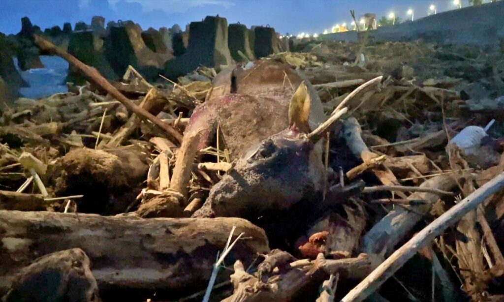 富岡海堤現大量漂流木 驚見保育水鹿屍體