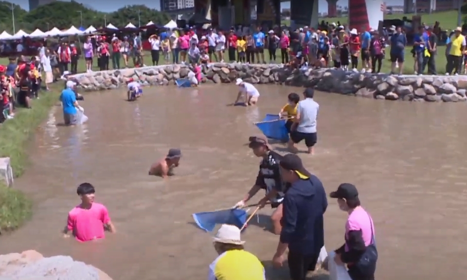 活動工作人員:「用網子喔!不能用手。」 頂著豔陽,青年打著赤膊將抓到的魚,速速放進麻布袋中,邁入第八年的《新北市原住民族捕魚祭》,11日在三重原住民族主題園區展開;一早來自各區的族人派出抓魚代表,要來看誰抓的魚最多。