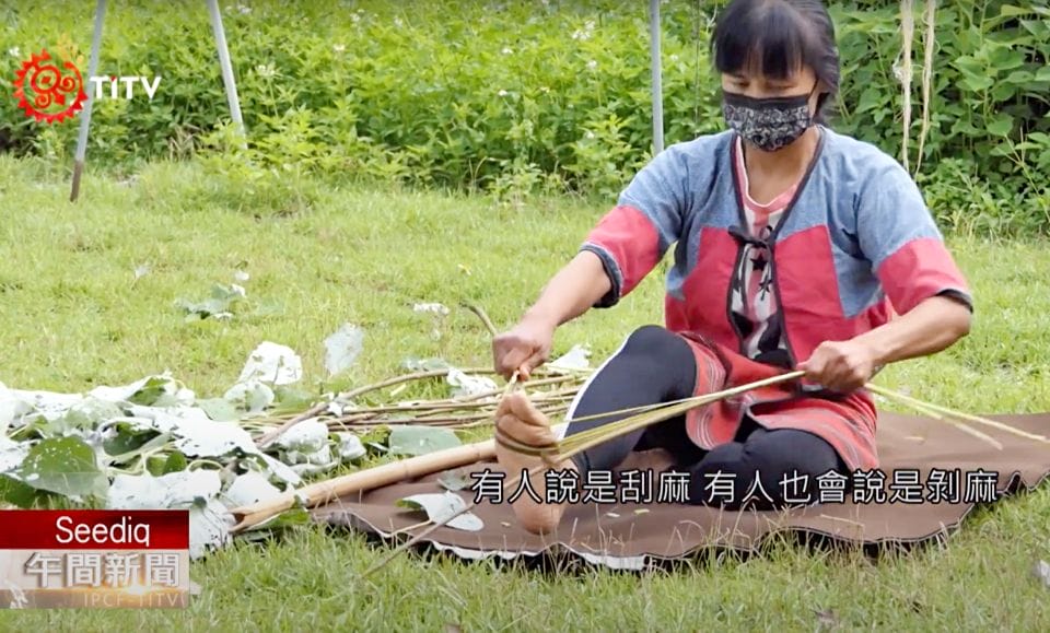 王小萍她向我們說明製作過程:「我們先去掉這個葉子,看老師我們剛把葉子去掉之後,先剝開這個步驟有人說是刮麻有人也會說剝麻,把中間那個心去掉留下那個纖維的部分,然後進行刮的動作,你看這個是需要用到刮麻器,以及手跟腳的力量,不要的部分刮掉,留下纖維的部分之後,就是形成我們之後要的線,從種植採集到刮麻洗麻,然後這樣大概要3到6個月的時間。」